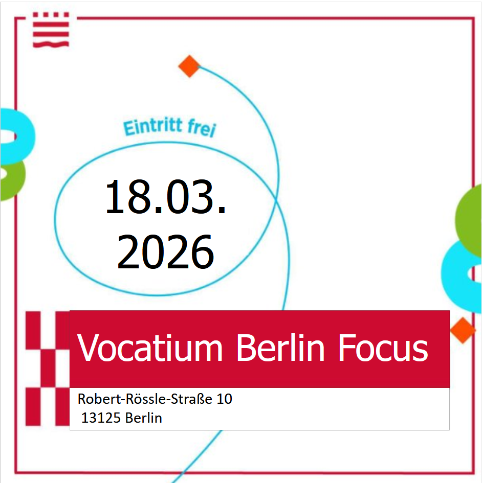Am Mittwoch, dem 18.03.2026, sind wir auf der Messe Vocatium Berlin focus zu finden und beraten Euch zu unseren 25 Studiengängen der 3 Fachbereiche. Ihr findet uns von 08.30 bis 14.45 Uhr in der Robert-Rössle-Straße 10, 13125 Berlin. Wir freuen uns auf Euch.